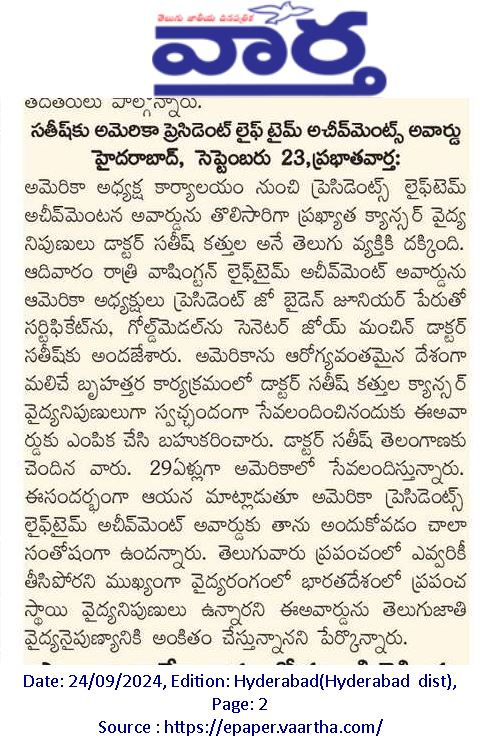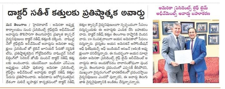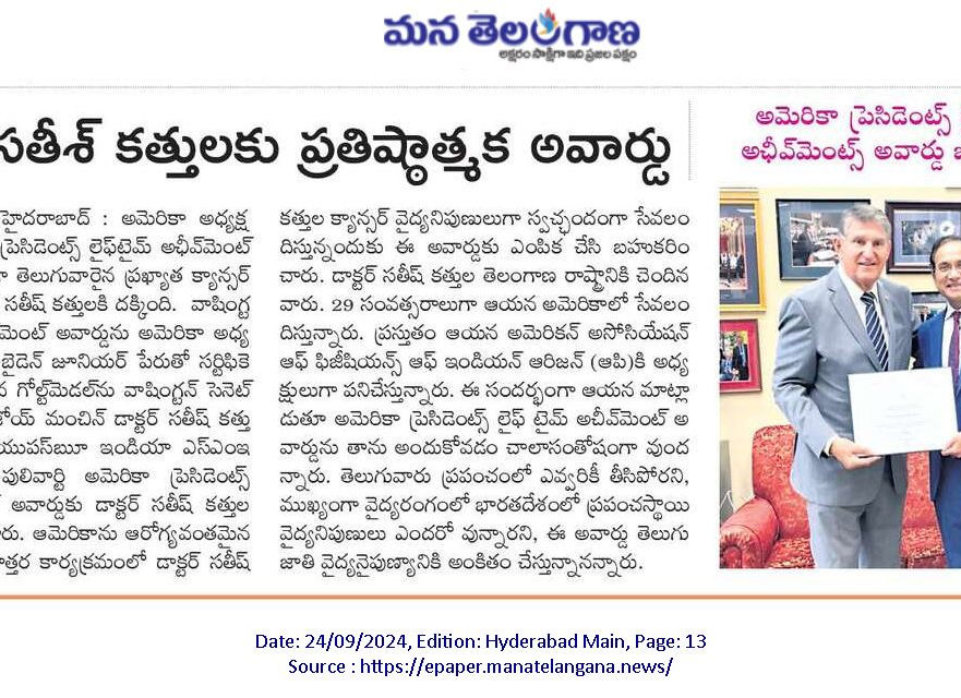 Sen. Joe Manchin honors AAPI President Dr. Satheesh Kathula with President’s Lifetime Achievement Award